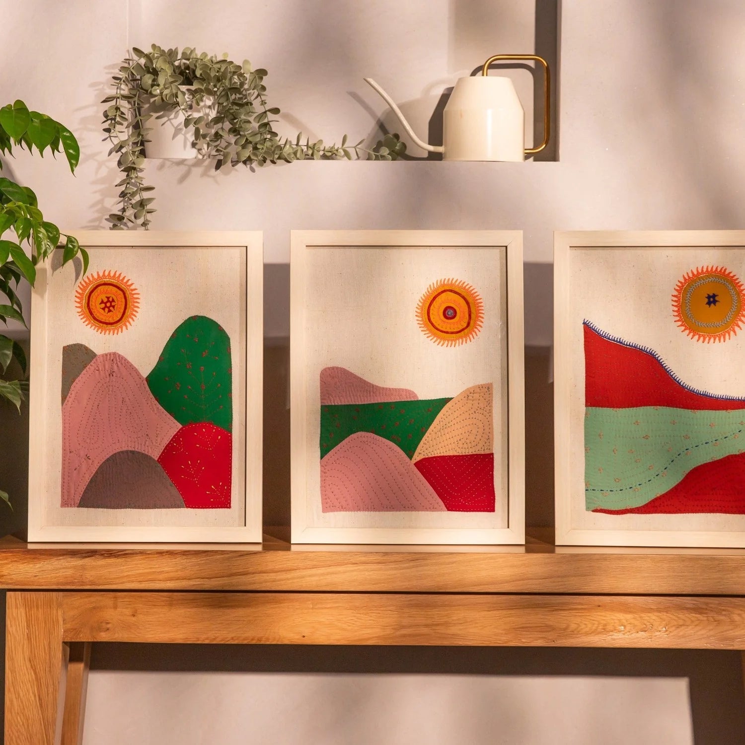 Introducing a brand new craft is always exciting specially when it comes from the land of embroidery in India- Kutch. Our modern interpretation of landscape with traditional dhebaria embroidery is a vision. With colorful applique mountains, a unique take on the sun with a hand sewn mirror, this enchanting piece of wall art is a must have in your modern homes.